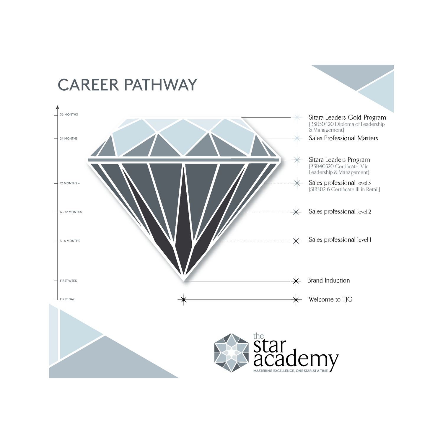 The beauty of The Star Academy is that you can see your career potential mapped out. Our Learning Pathway demonstrates Your Journey—from induction to sales mastery and leadership. As you progress, you will gain new skills and open doors to exciting career opportunities inside and outside Zamel’s.