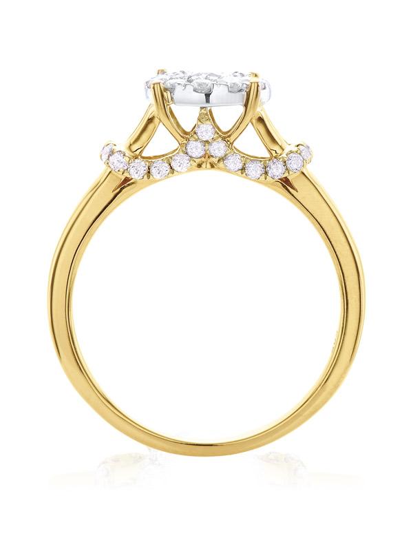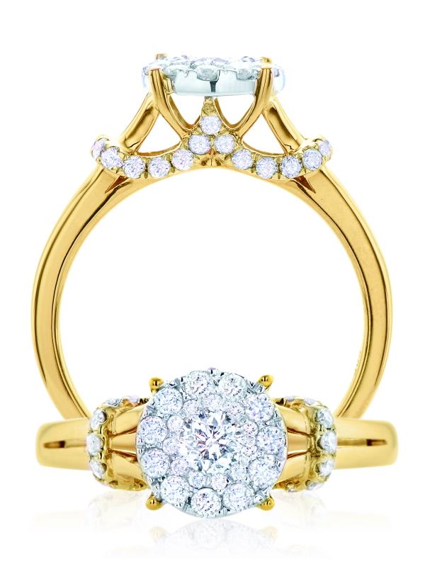 Our Paris Collection draws inspiration from the catwalks and traditional styling of iconic Parisian structures. This 14ct two tone double halo ring with collars of diamonds decorating the shoulders, totals 3/4 Carat tw of diamonds.