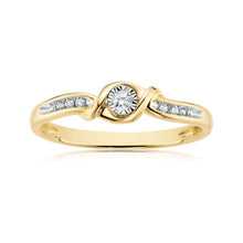 Add some sparkle to your day with this 9ct Yellow Gold ring. A round brilliant cut diamond set within a polished twist, is complimented by channel set shoulders.
