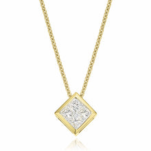 Every piece in the New York Collection is designed to make a bold and glamorous statement, inspired by the city that never sleeps. This 14ct Yellow Gold pendant features four princess cut diamonds in the Times Square bezel setting, totalling 1/4 Carat tw.
