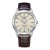 A modern timepiece that displays classic aesthetic appeal. The looks of this watch are equally matched by its reliability. A smooth silver/white sleek dial and oxhide brown leather bracelet. Features include Day/ Date, and low charge indicator. Powered by our Eco drive, never needs a battery, only a light source.