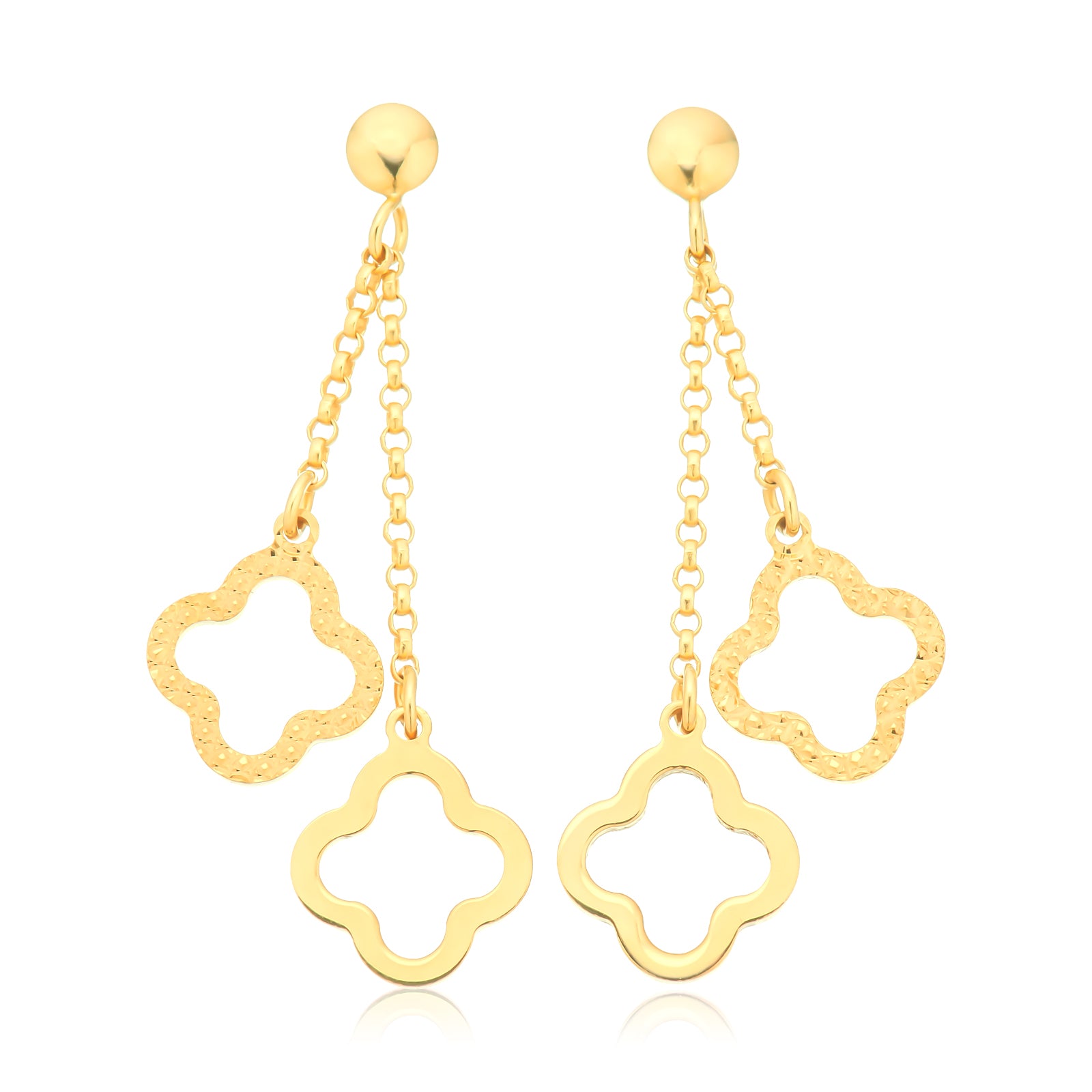 Indulge in these exquisite 9ct Yellow Gold Silver-Filled Clover Double Drop Earrings. The perfect blend of luxury and sophistication, these earrings feature a stunning clover design inlaid with sleek silver. Elevate any outfit with these exclusive and timeless pieces.
