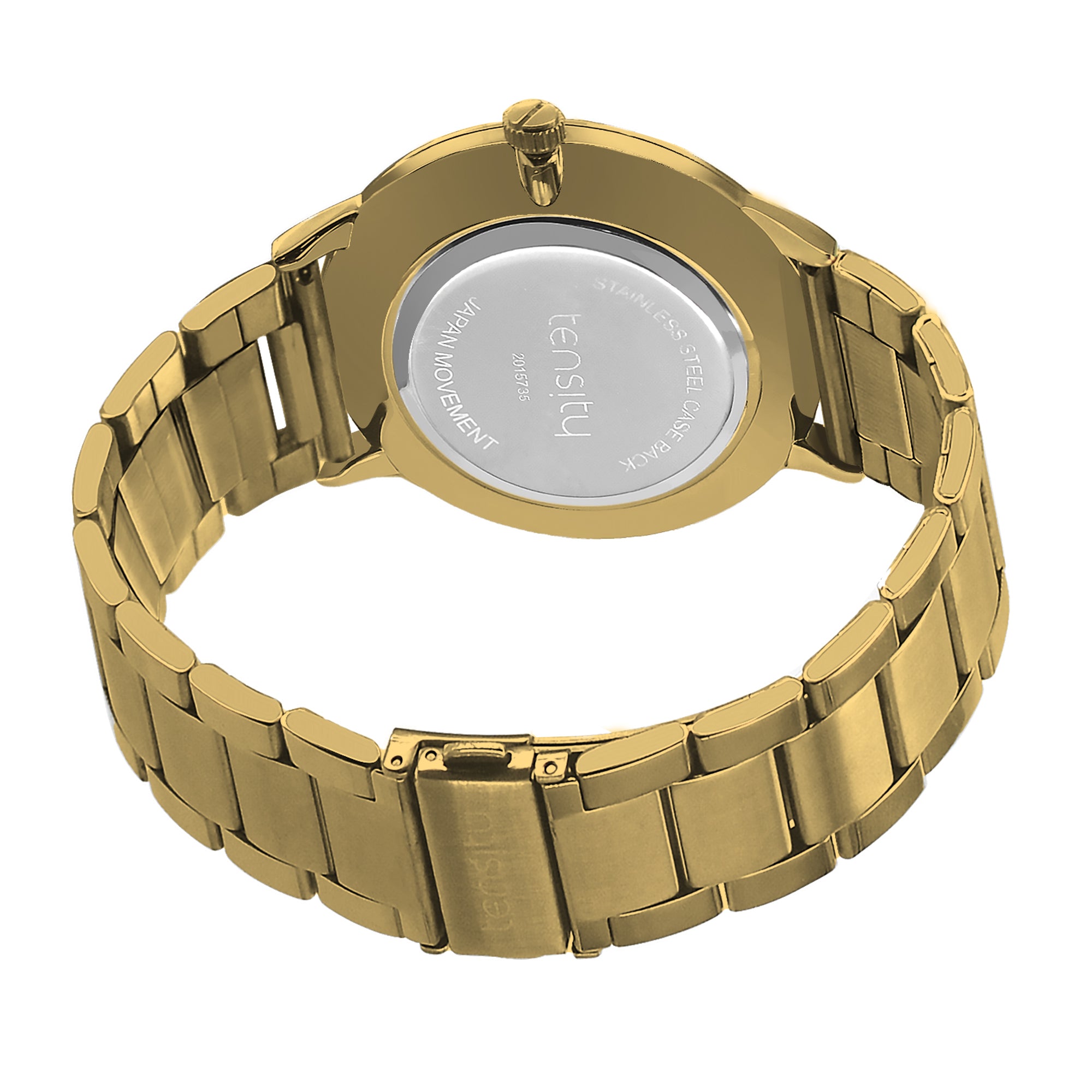 Indulge in luxury with the Tensity Stainless Steel Round Silver Dial Gold Band Watch. Featuring a sleek stainless steel design and a classic silver dial, this watch is sure to elevate any outfit. The gold band adds a touch of elegance, making this watch a must-have for any sophisticated individual.