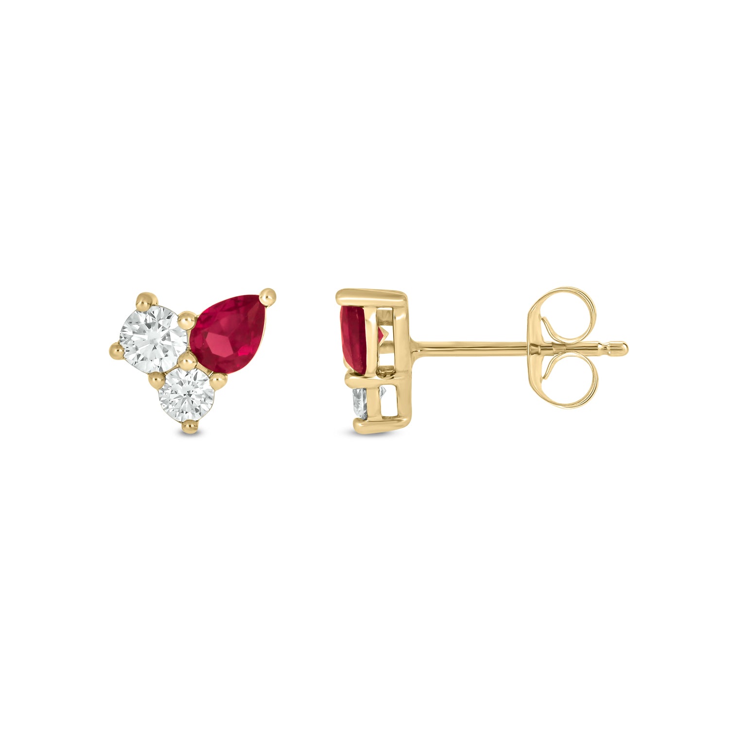 Introducing a stunning stud earrings made of 9ct yellow gold, featuring a pear cut created ruby set amidst 0.30 carat total weight of round cut lab-grown diamonds. A perfect combination of luxury and sustainability, this pendant is a true masterpiece that will add a touch of elegance and sophistication to any outfit.
