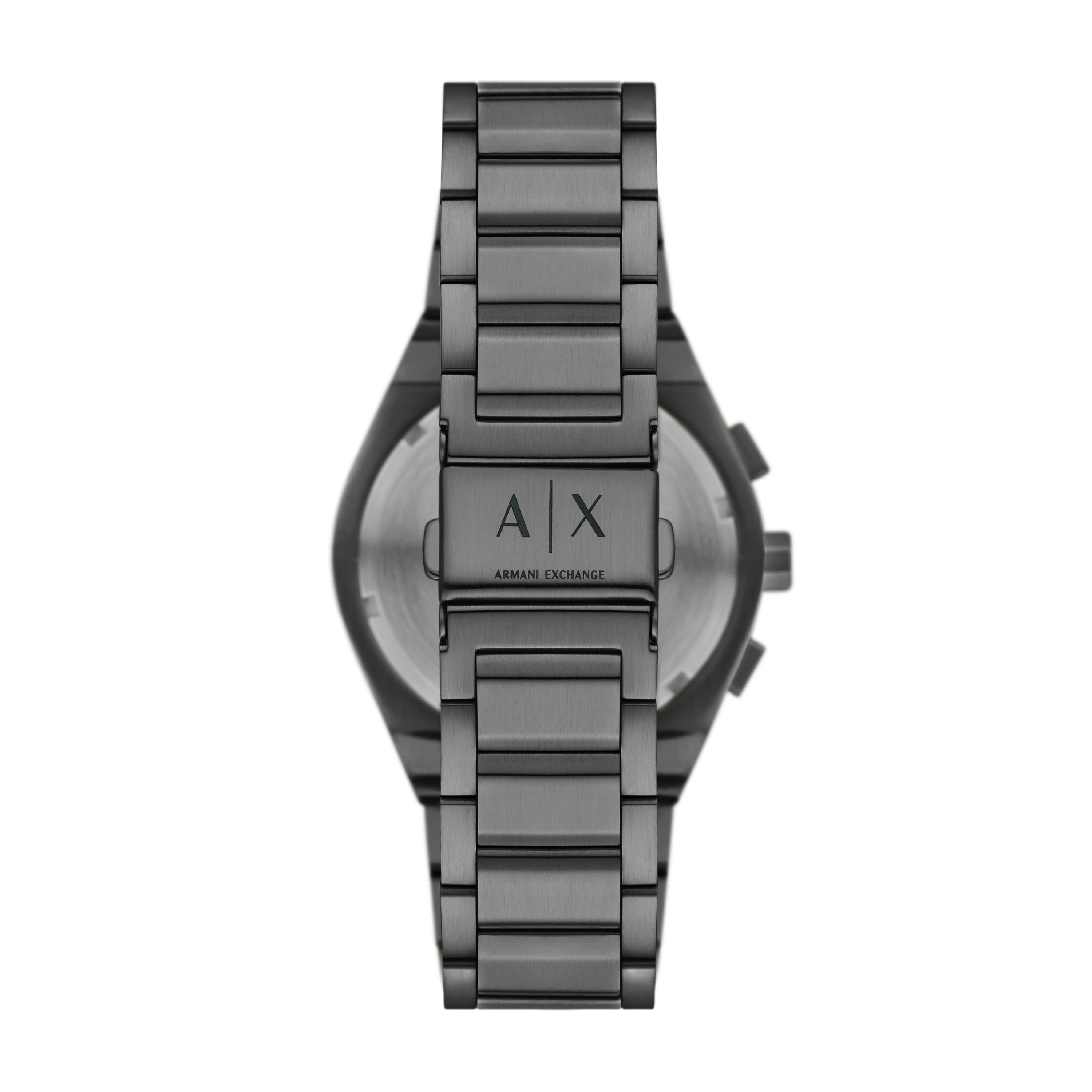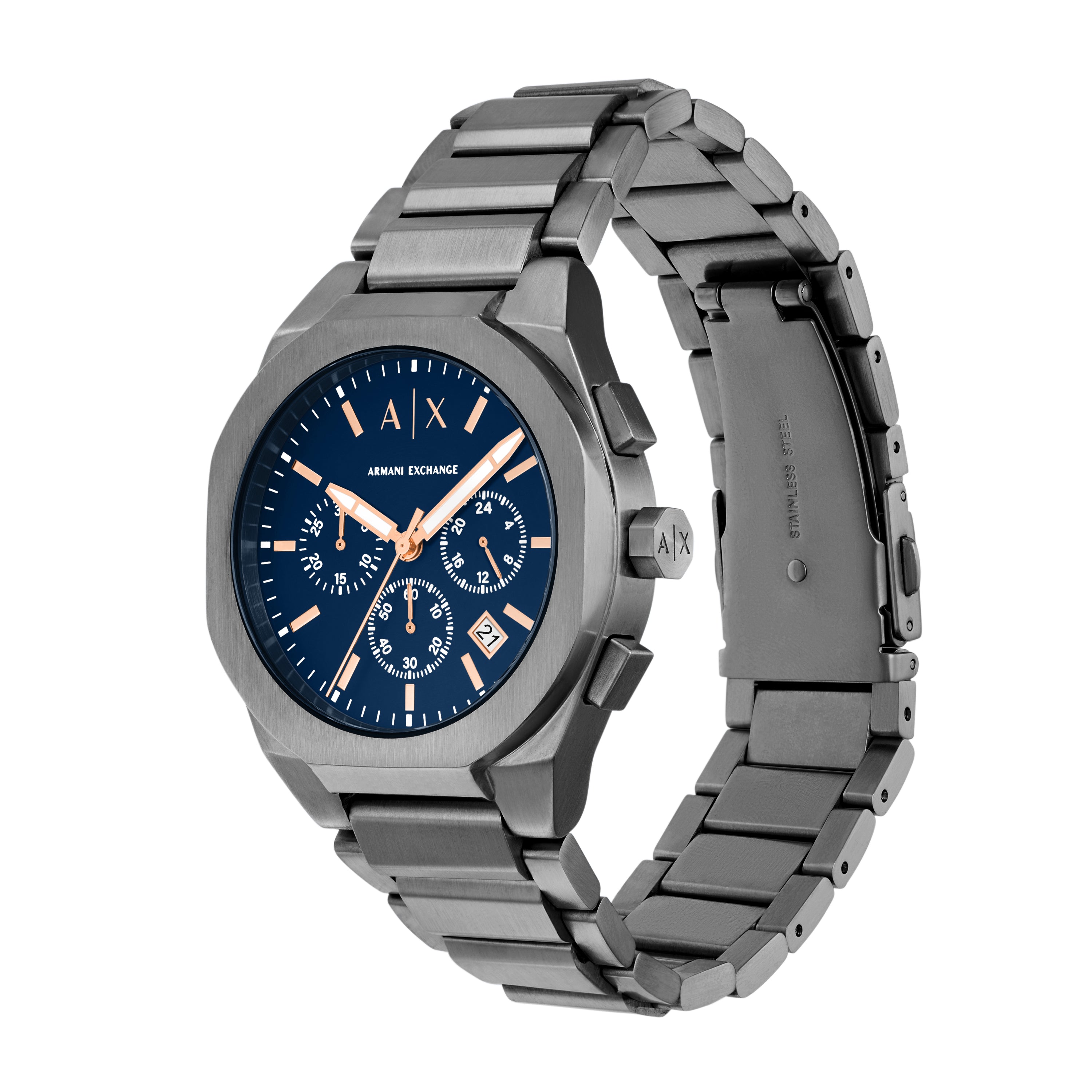 Armani Exchange's 42mm watch features a blue sunray dial, chronograph movement and gunmetal stainless steel bracelet.