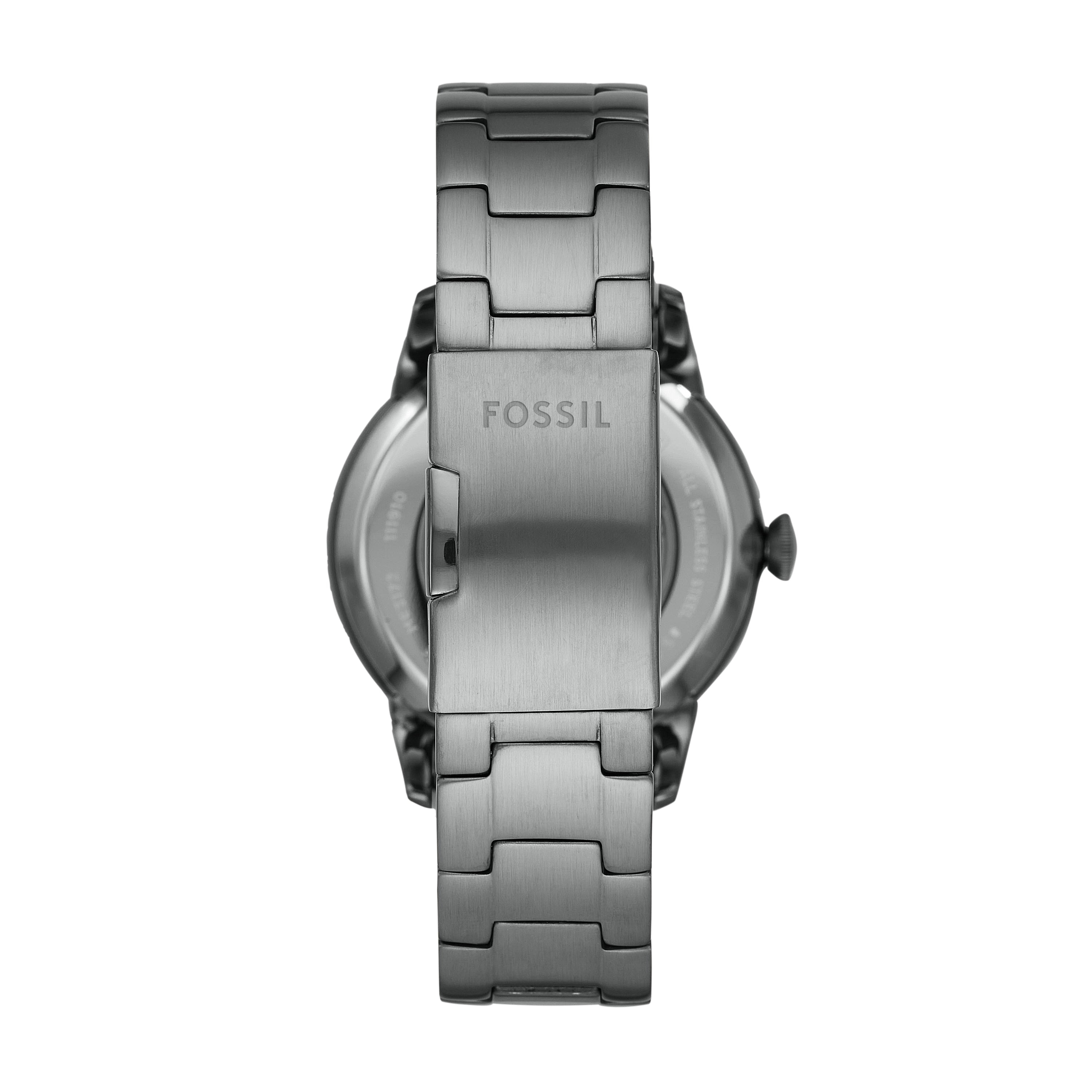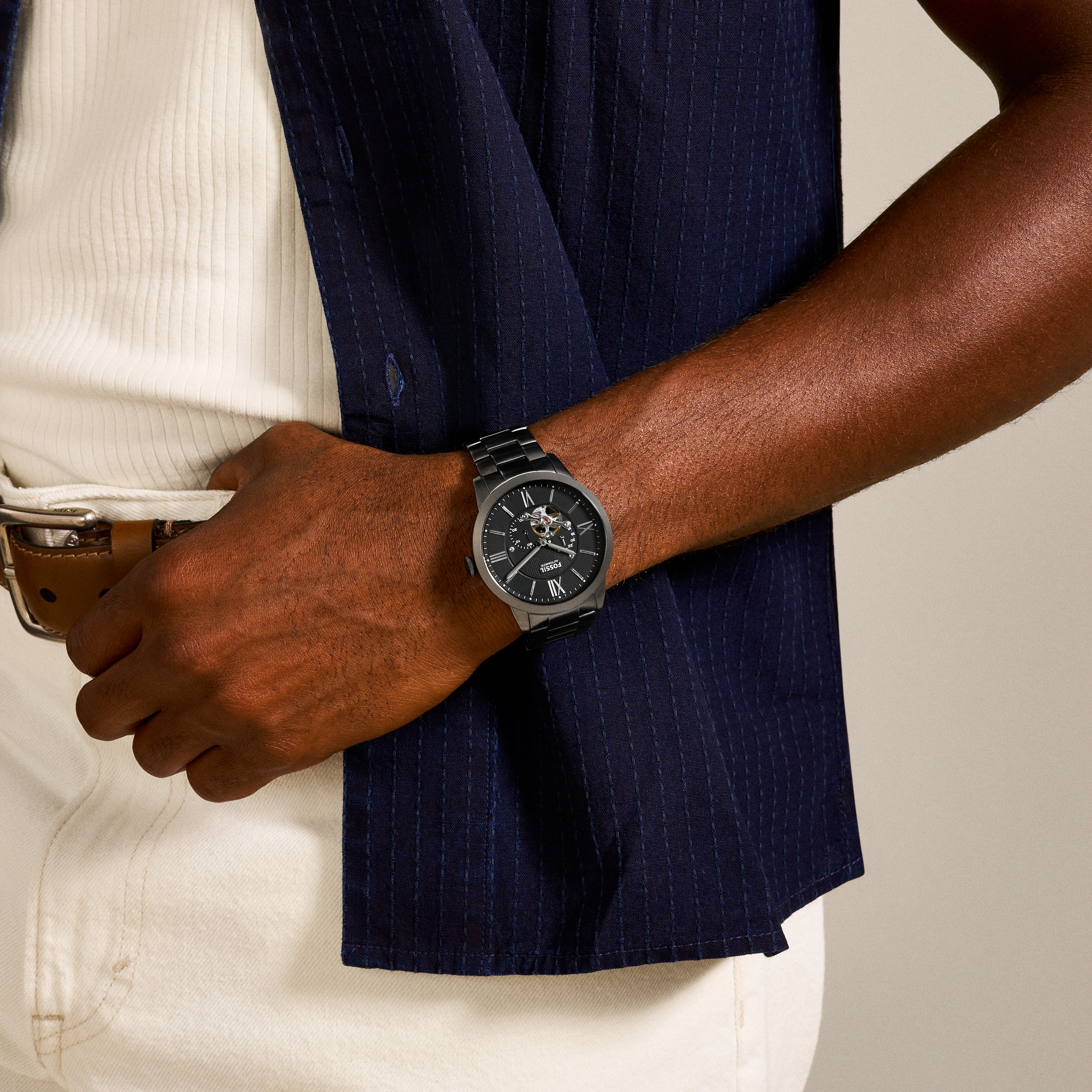 This 44mm Townsman features a black satin dial with a see-through skeleton sub-eye, automatic movement and a smoke stainless steel bracelet.