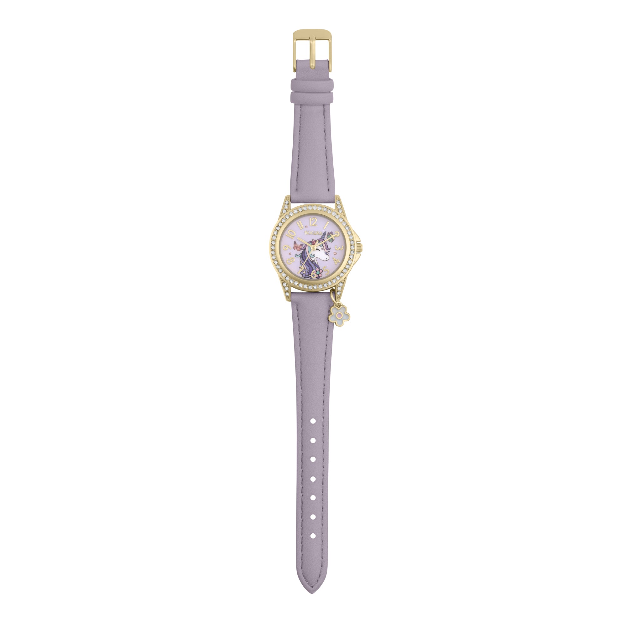 This Tikkers unicorn kids watch is straight out of a fairytale! The pale gold tone watch is complimented by a stunning stone set bezel and the lilac gloss unicorn dial is sure to capture the imagination of your little one. For added comfort the watch is finished with a padded lilac leatherette strap, hanging flower charm and stainless steel buckle.