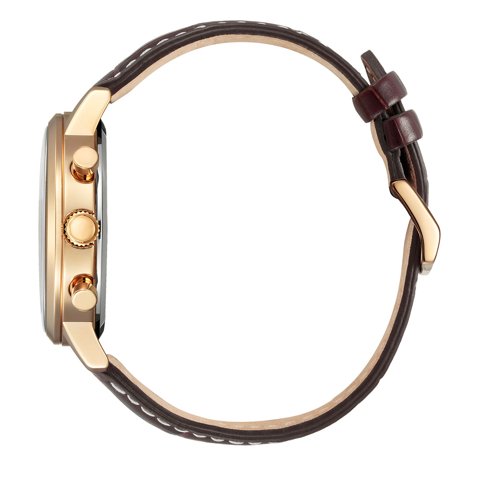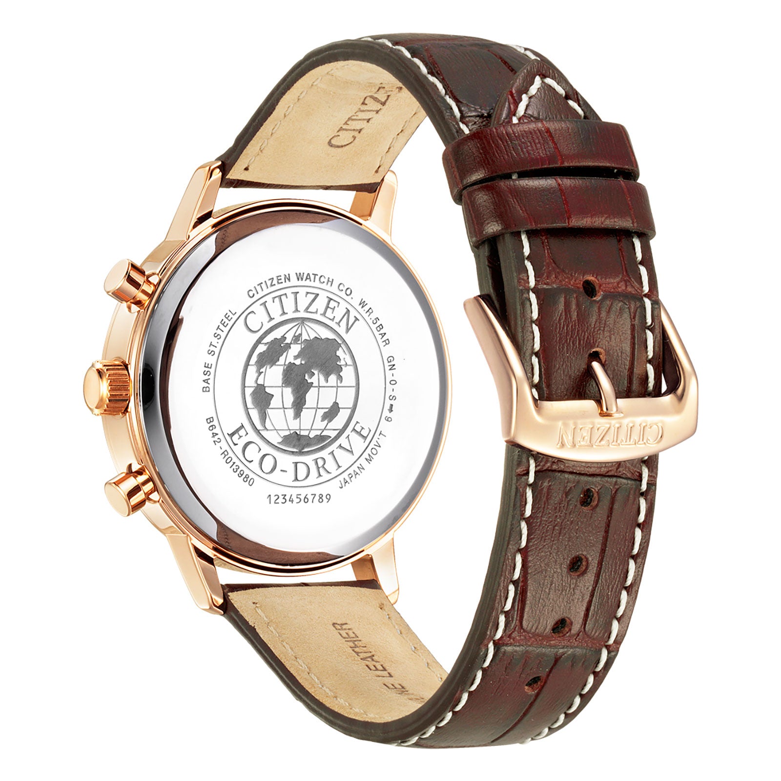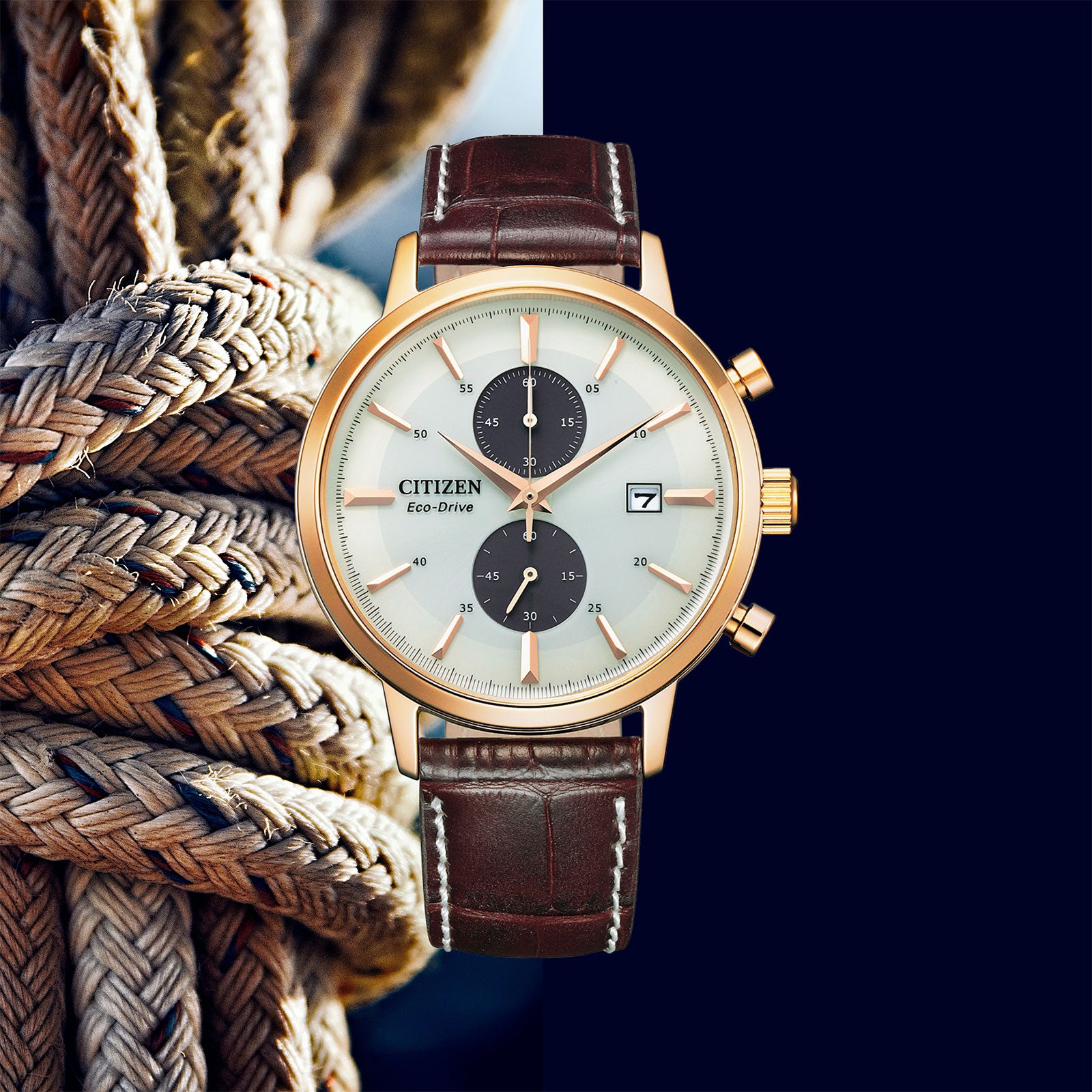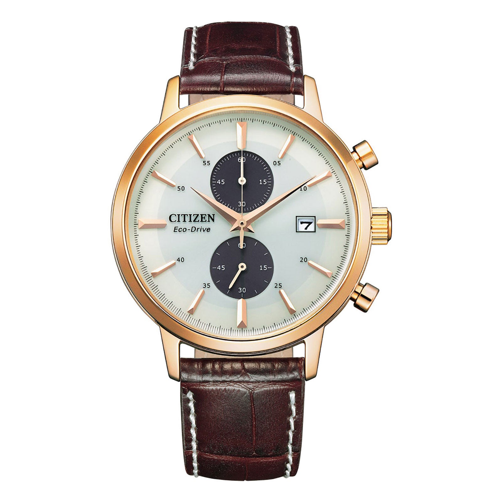 A modern timepiece that displays a classic aesthetic appeal. The looks of this watch are equally matched by its reliability. A smooth dusty white sleek dial and brown oxhide leather strap. Features include Date, push button buckle and low charge indicator. Powered by Eco drive, never needs a battery, only a light source.